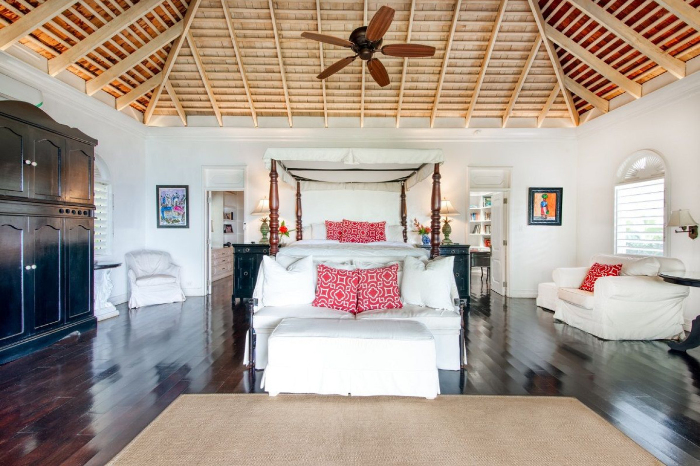 Indulge in ultimate relaxation in our beautifully appointed accommodations, featuring seven spacious bedrooms designed to provide the utmost comfort and privacy. The master bedroom, a luxurious sanctuary in itself, boasts a high king-size four-poster bed, two separate Travertine marble his 'n' hers bathrooms, and a private 26-foot covered veranda overlooking the sea. Each bedroom is thoughtfully designed with your comfort in mind, offering en-suite bathrooms, plush bedding, and stunning views.
